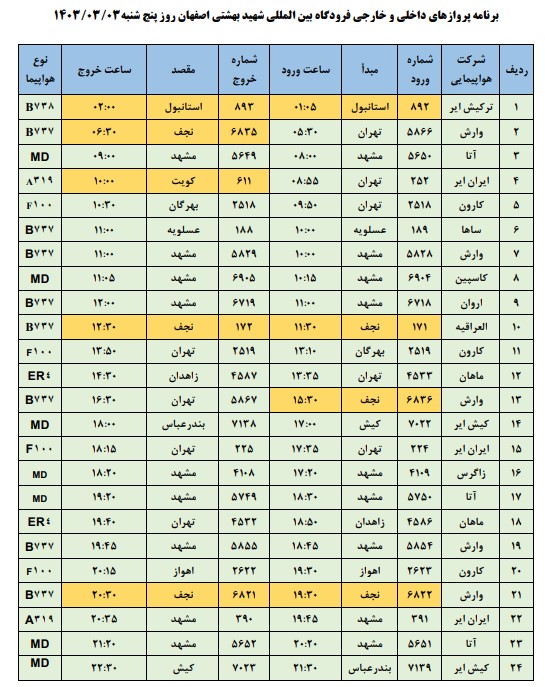 به گزارش نبض وطن، اطلاعات پروازهای داخلی و خارجی فرودگاه بینالمللی شهید بهشتی اصفهان امروز _پنجشنبه سوم خرداد__ به شرح زیر است: