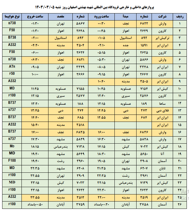 به گزارش نبض وطن، اطلاعات پروازهای داخلی و خارجی فرودگاه بینالمللی شهید بهشتی اصفهان امروز _شنبه پنجم خرداد__ به شرح زیر است: