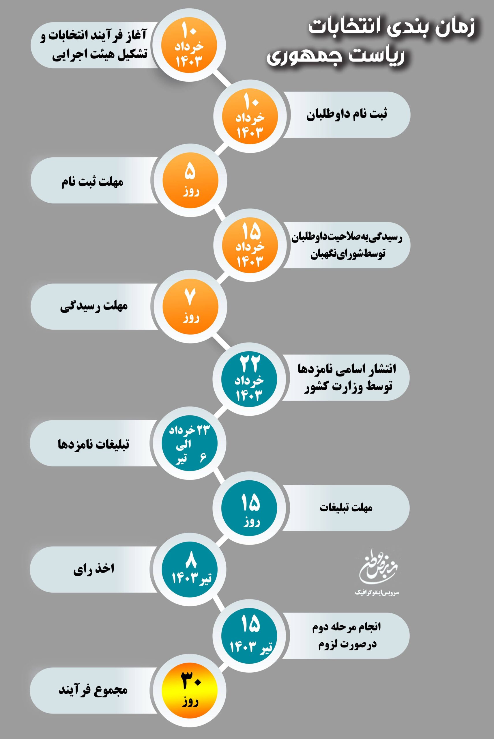 مطابق با اصل ۱۳۱ قانون اساسی جمهوری اسلامی ایران، اخذ رأی در تمامی شعب داخل و خارج از کشور به مدت یک روز و در تاریخ هشتم تیرماه ۱۴۰۳ انجام خواهد شد.کلیات جدول زمان بندی انتخابات چهاردهمین دوره ریاست جمهوری مطابق با اصل ۱۳۱ قانون اساسی به شرح زیر است: