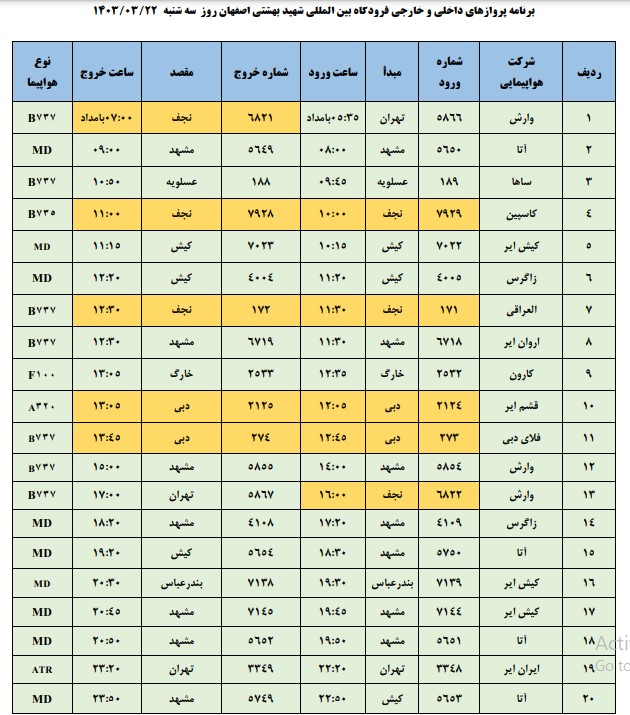 به گزار ش نبض وطن، اطلاعات پروازهای داخلی و خارجی فرودگاه بینالمللی شهید بهشتی اصفهان امروز _سه شنبه بیست و دوم خرداد_به شرح زیر است:
