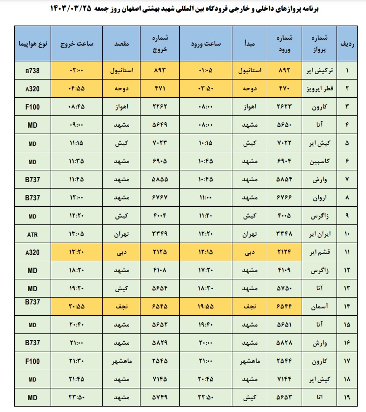 به گزار ش نبض وطن، اطلاعات پروازهای داخلی و خارجی فرودگاه بینالمللی شهید بهشتی اصفهان امروز _جمعه بیست و پنجم خرداد_به شرح زیر است: