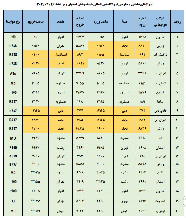به گزار ش نبض وطن، اطلاعات پروازهای داخلی و خارجی فرودگاه بینالمللی شهید بهشتی اصفهان امروز _شنبه بیست و ششم خرداد_به شرح زیر است: