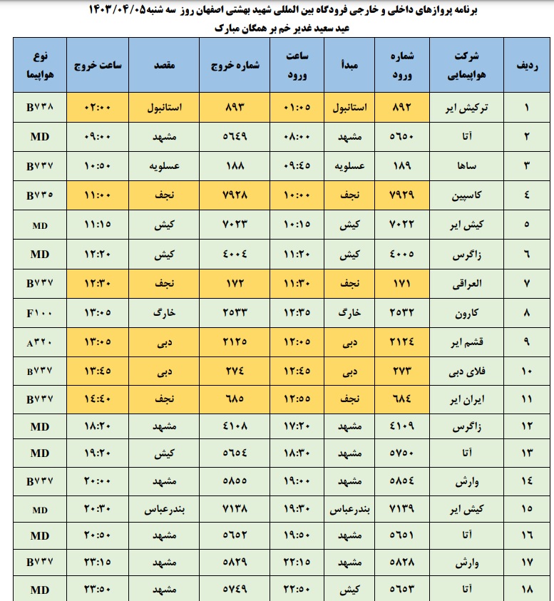 به گزارش نبض وطن، اطلاعات پروازهای داخلی و خارجی فرودگاه بینالمللی شهید بهشتی اصفهان امروز _سهشنبه پنجم تیر_ به شرح زیر است: