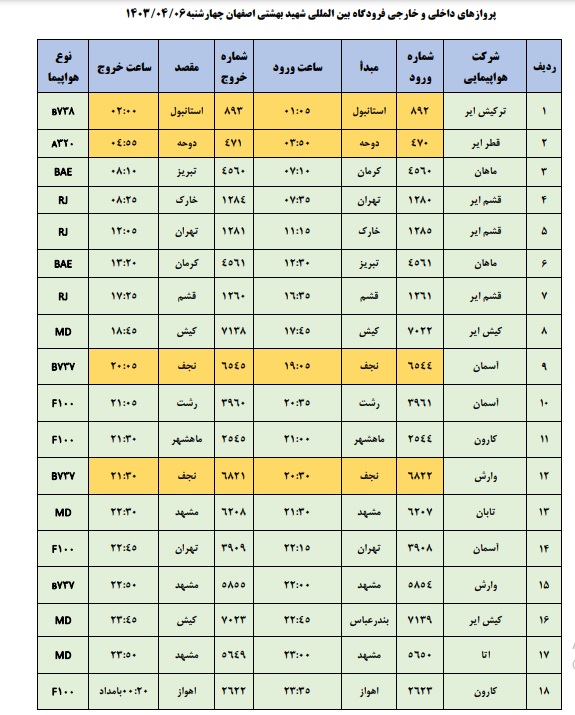 به گزارش نبض وطن، اطلاعات پروازهای داخلی و خارجی فرودگاه بینالمللی شهید بهشتی اصفهان امروز _چهارشنبه ششم تیر_ به شرح زیر است: