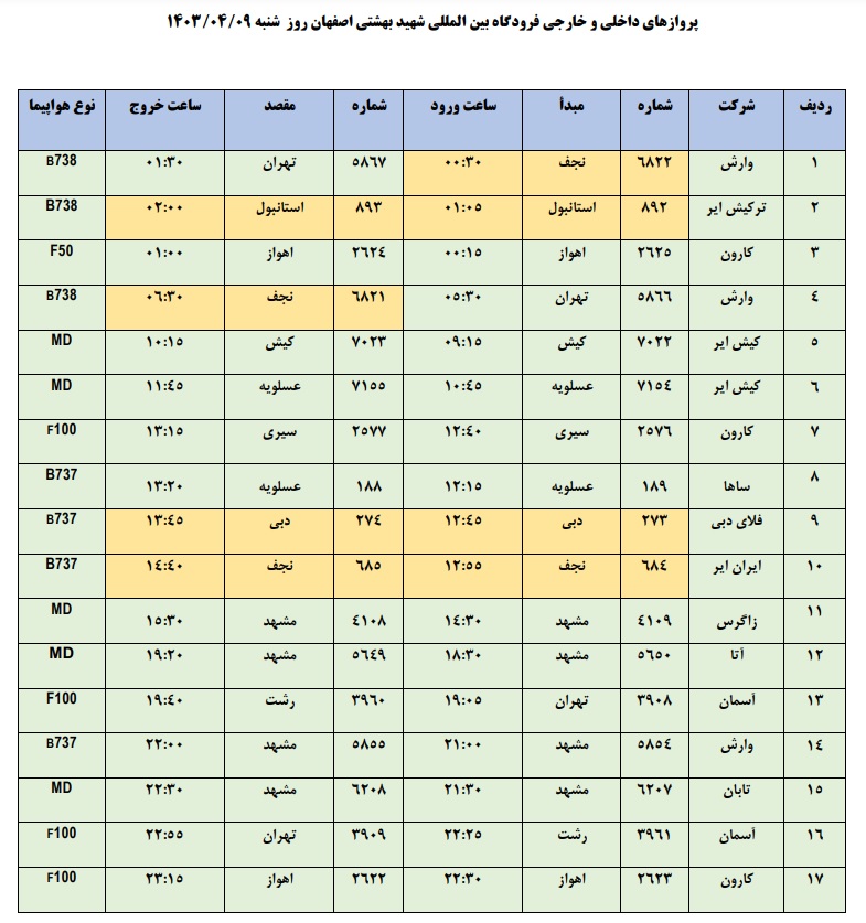 به گزارش نبض وطن، اطلاعات پروازهای داخلی و خارجی فرودگاه بینالمللی شهید بهشتی اصفهان امروز _شنبه نهم تیر_ به شرح زیر است: