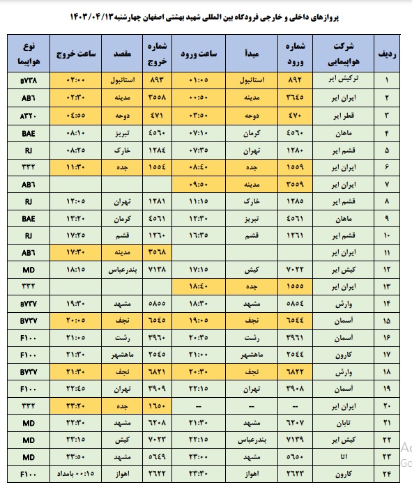 به گزارش نبض وطن، اطلاعات پروازهای داخلی و خارجی فرودگاه بینالمللی شهید بهشتی اصفهان امروز _چهارشنبه سیزدهم تیر_ به شرح زیر است: