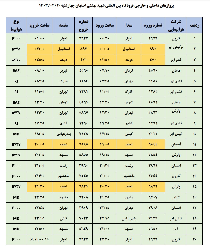 به گزارش نبض وطن، اطلاعات پروازهای داخلی و خارجی فرودگاه بینالمللی شهید بهشتی اصفهان امروز _چهارشنبه بیستم تیر_ به شرح زیر است: