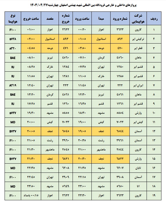 به گزارش نبض وطن، اطلاعات پروازهای داخلی و خارجی فرودگاه بینالمللی شهید بهشتی اصفهان امروز _سهشنبه بیست و هفتم تیر_ به شرح زیر است: