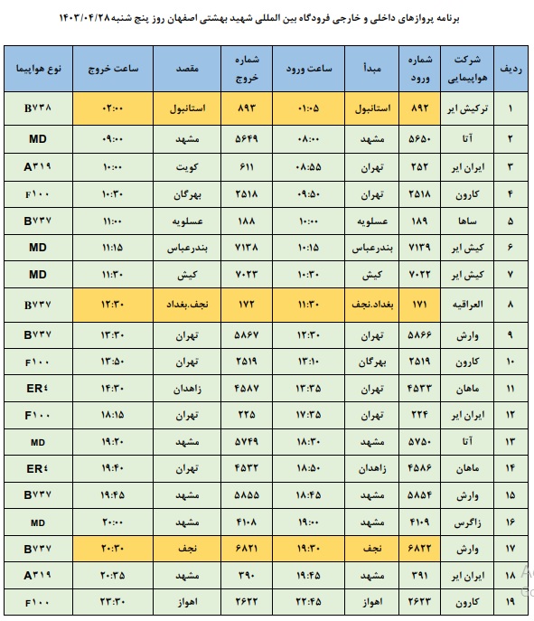 به گزارش نبض وطن، اطلاعات پروازهای داخلی و خارجی فرودگاه بینالمللی شهید بهشتی اصفهان امروز _سهشنبه بیست و هشتم تیر_ به شرح زیر است: