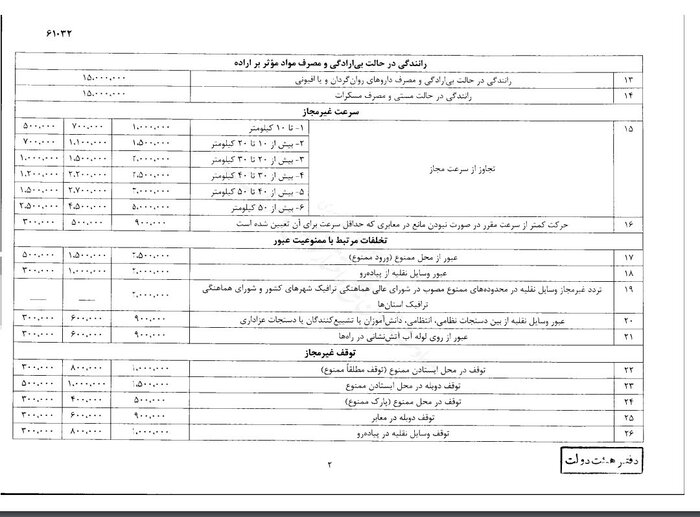 در این نرخنامه دنده عقب در آزادراهها و بزرگراهها ۵۰۰ هزار تومان جریمه دارد و رانندگانی که در حالت بی ارادگی و مصرف داروهای روان گردان یا افیونی و همچنین در حالت مستی اقدام به رانندگی کنند، یک میلیون و ۵۰۰ هزار تومان جریمه می شوند.