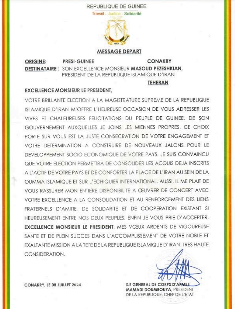 انتخابات درخشان شما به مقام عالی جمهوری اسلامی ایران این فرصت مبارک را به من می دهد تا تبریکات صمیمانه و گرم مردم گینه، دولت آن و تبریکات خود را خطاب به شما ارسال کنم.