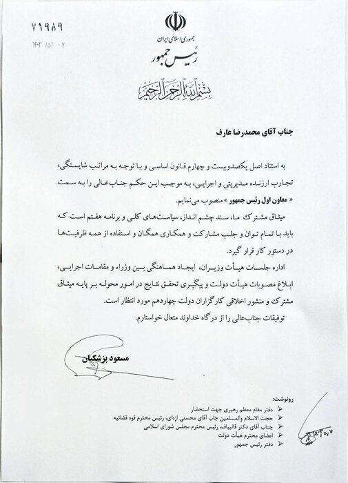 «مسعود پزشکیان» رئیس جمهور اسلامی ایران، ظهر امروز -۷ مرداد ۱۴۰۳- و ساعتی پس از تنفیذ حکم ریاست جمهوری چهاردهم توسط رهبر معظم انقلاب، طی حکمی «محمدرضا عارف» را به عنوان معاون اول خود منصوب کرد.