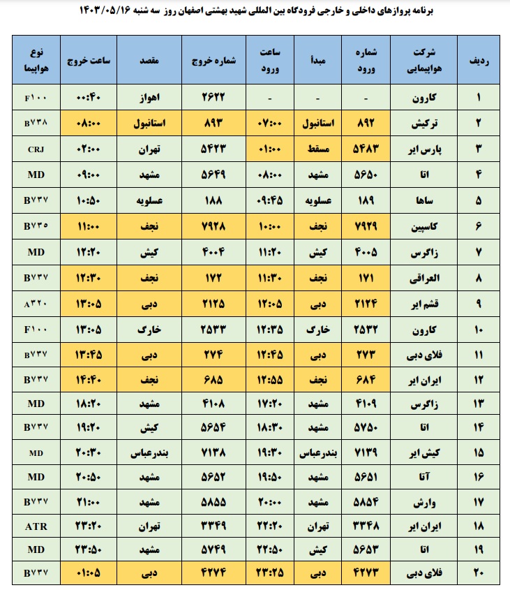 به گزارش نبض وطن، اطلاعات پروازهای داخلی و خارجی فرودگاه بینالمللی شهید بهشتی اصفهان امروز _سهشنبه شانزدهم مرداد_ به شرح زیر است: