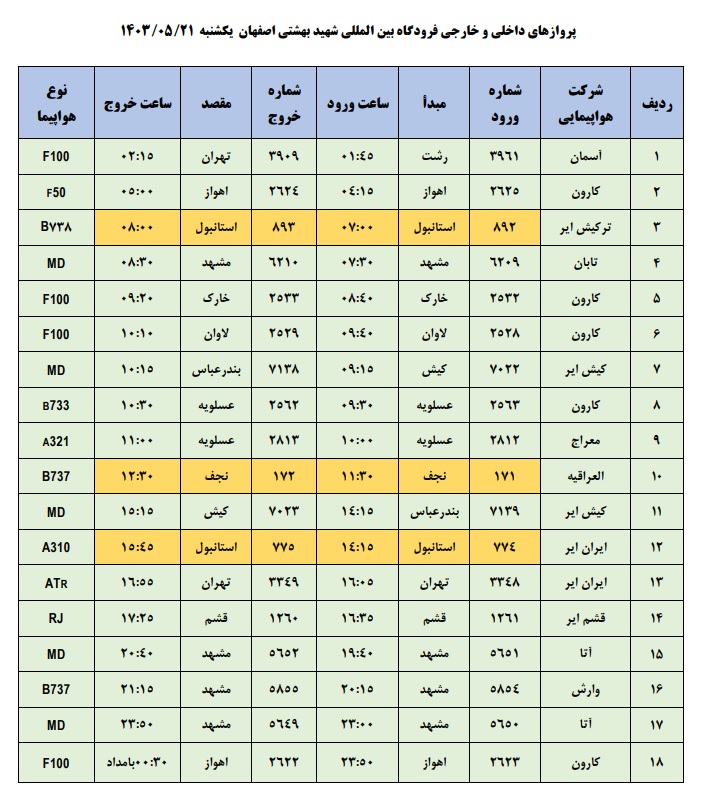 به گزارش نبض وطن، اطلاعات پروازهای داخلی و خارجی فرودگاه بینالمللی شهید بهشتی اصفهان امروز _شنبه بیست و یکم مرداد_ به شرح زیر است: