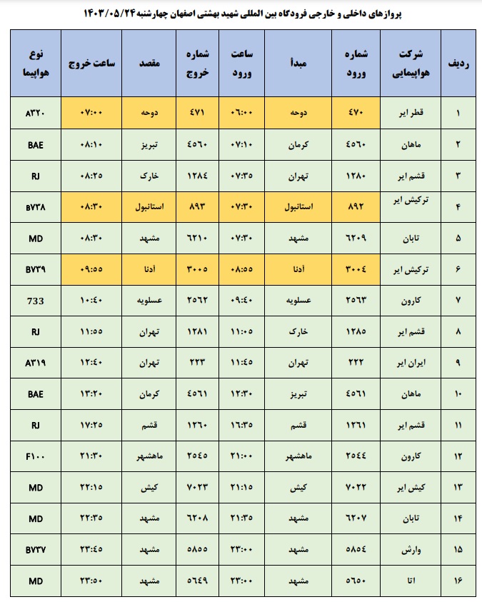 به گزارش نبض وطن، اطلاعات پروازهای داخلی و خارجی فرودگاه بینالمللی شهید بهشتی اصفهان امروز _چهارشنبه بیست و چهارم مرداد_ به شرح زیر است: