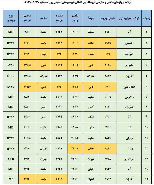به گزارش ببض وطن، اطلاعات پروازهای داخلی و خارجی فرودگاه بینالمللی شهید بهشتی اصفهان امروز _سهشنبه سیام مرداد_ به شرح زیر است: