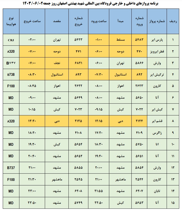 به گزارش ببض وطن، اطلاعات پروازهای داخلی و خارجی فرودگاه بینالمللی شهید بهشتی اصفهان امروز _جمعه دوم شهریور_ به شرح زیر است:
