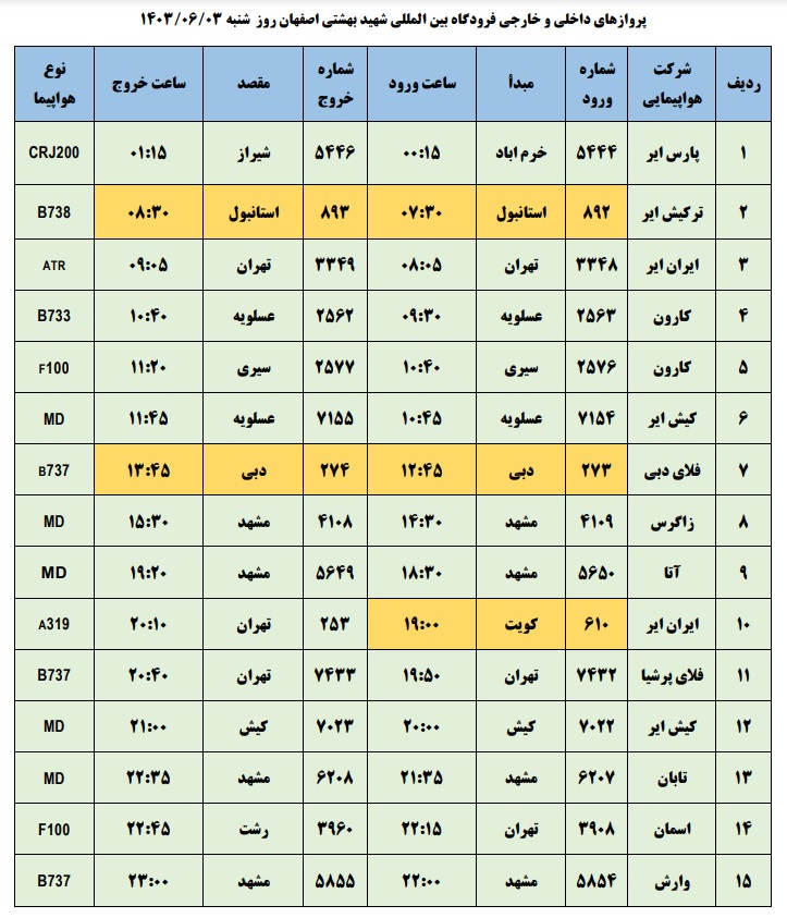 به گزارش ببض وطن، اطلاعات پروازهای داخلی و خارجی فرودگاه بینالمللی شهید بهشتی اصفهان امروز _شنبه سوم شهریور_ به شرح زیر است: