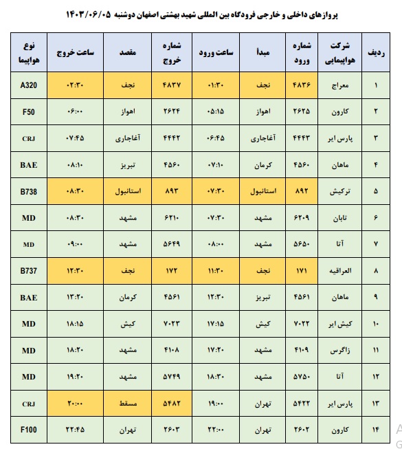 به گزارش ببض وطن، اطلاعات پروازهای داخلی و خارجی فرودگاه بینالمللی شهید بهشتی اصفهان امروز _دوشنبه پنجم شهریور_ به شرح زیر است: