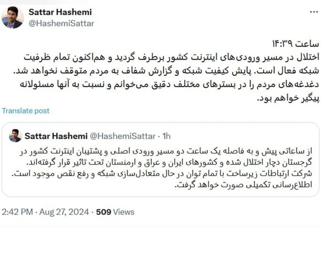 به گزارش نبض وطن، ستار هاشمی در توئیتی نوشت: «از ساعاتی پیش و به فاصله یک ساعت دو مسیر ورودی اصلی و پشتیبان اینترنت کشور در گرجستان دچار اختلال شده و کشورهای ایران و عراق و ارمنستان تحت تأثیر قرار گرفتهاند.