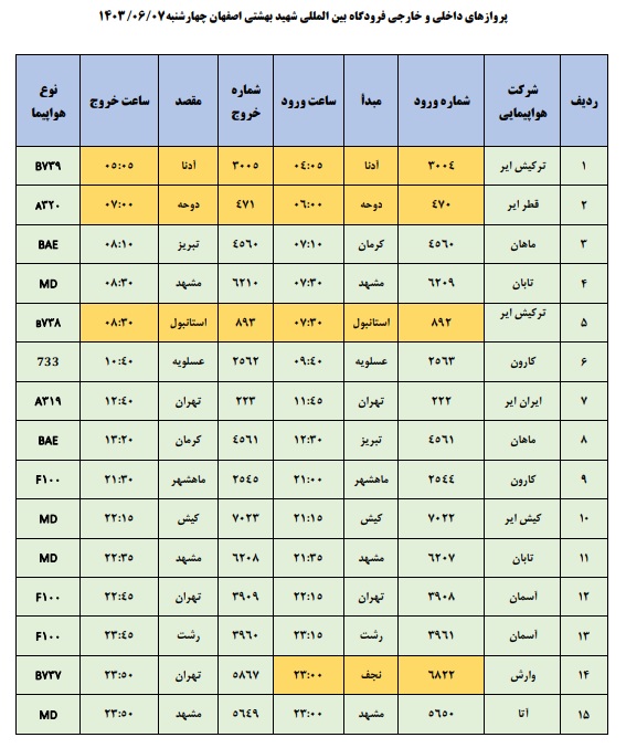به گزارش ببض وطن، اطلاعات پروازهای داخلی و خارجی فرودگاه بینالمللی شهید بهشتی اصفهان امروز _چهارشنبه هفتم شهریور_ به شرح زیر است: