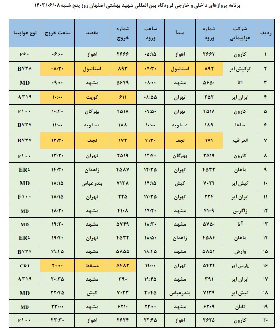 به گزارش ببض وطن، اطلاعات پروازهای داخلی و خارجی فرودگاه بینالمللی شهید بهشتی اصفهان امروز _پنجشنبه هشتم شهریور_ به شرح زیر است: