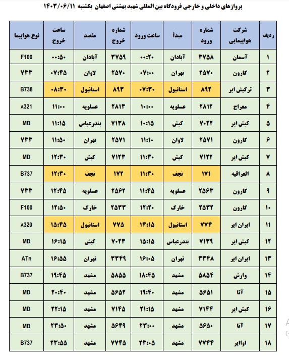 به گزارش نبض وطن، اطلاعات پروازهای داخلی و خارجی فرودگاه بینالمللی شهید بهشتی اصفهان امروز _یکشنبه یازدهم شهریور_ به شرح زیر است: