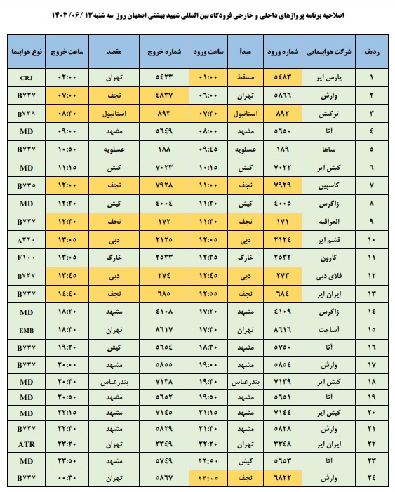 جهت اطلاع از تأخیرها و تغییر برنامه پروازی با تلفن ۱۹۹ از اصفهان و شماره ۳۵۲۷۵۲۰۰ از شهرستانها تماس بگیرید یا به تارنمای فرودگاه به نشانی https://isfahan.airport.ir مراجعه کنید.