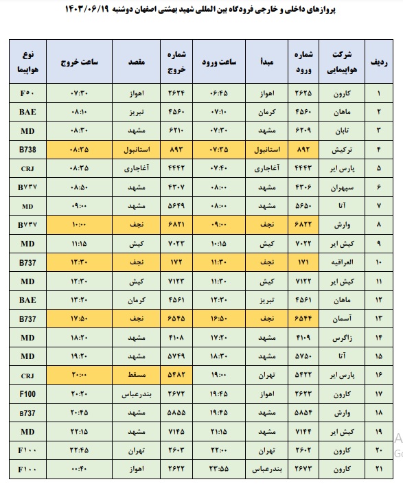 به گزارش نبض وطن، اطلاعات پروازهای داخلی و خارجی فرودگاه بینالمللی شهید بهشتی اصفهان امروز _دوشنبه نوزدهم شهریور_ به شرح زیر است: