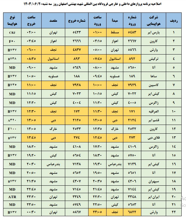 جهت اطلاع از تأخیرها و تغییر برنامه پروازی با تلفن ۱۹۹ از اصفهان و شماره ۳۵۲۷۵۲۰۰ از شهرستانها تماس بگیرید یا به تارنمای فرودگاه به نشانی https://isfahan.airport.ir مراجعه کنید.