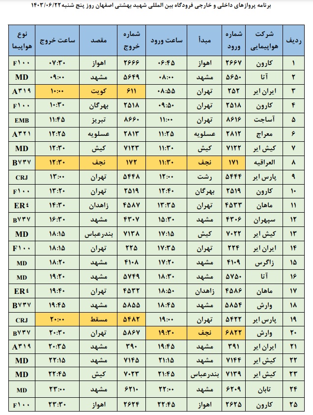 به گزارش نبض وطن، اطلاعات پروازهای داخلی و خارجی فرودگاه بینالمللی شهید بهشتی اصفهان امروز _پنجشنبه بیست و دوم شهریور_ به شرح زیر است: