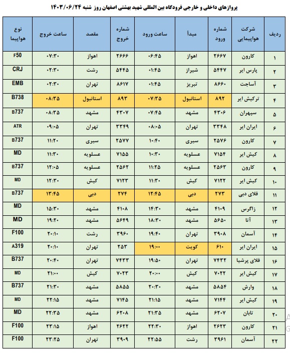به گزارش نبض وطن، اطلاعات پروازهای داخلی و خارجی فرودگاه بینالمللی شهید بهشتی اصفهان امروز _شنبه بیست و چهارم شهریور_ به شرح زیر است: