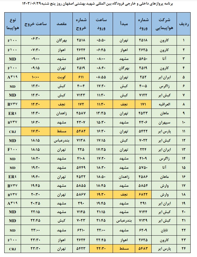 به گزارش نبض وطن، اطلاعات پروازهای داخلی و خارجی فرودگاه بینالمللی شهید بهشتی اصفهان امروز _پنجشنبه بیست و نهم شهریور_ به شرح زیر است: