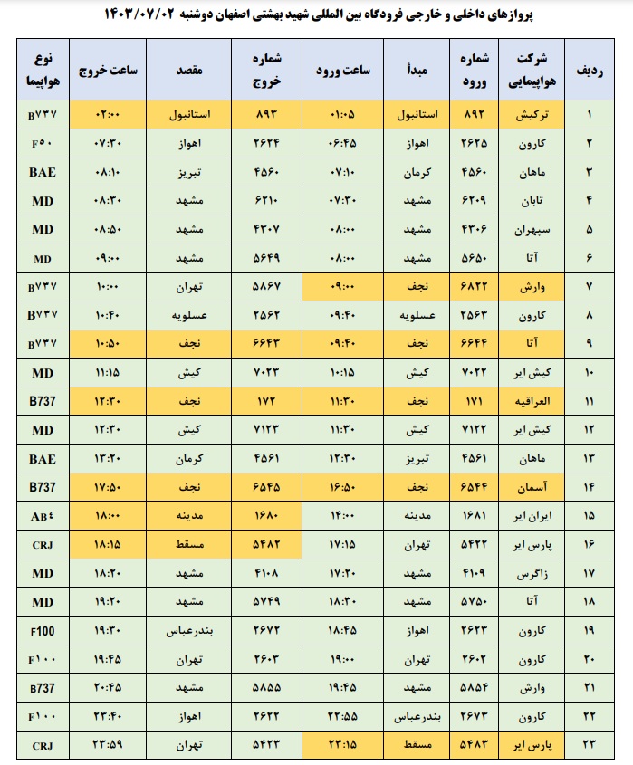 به گزارش نبض وطن، اطلاعات پروازهای داخلی و خارجی فرودگاه بینالمللی شهید بهشتی اصفهان امروز _دوشنبه دوم مهر_ به شرح زیر است: