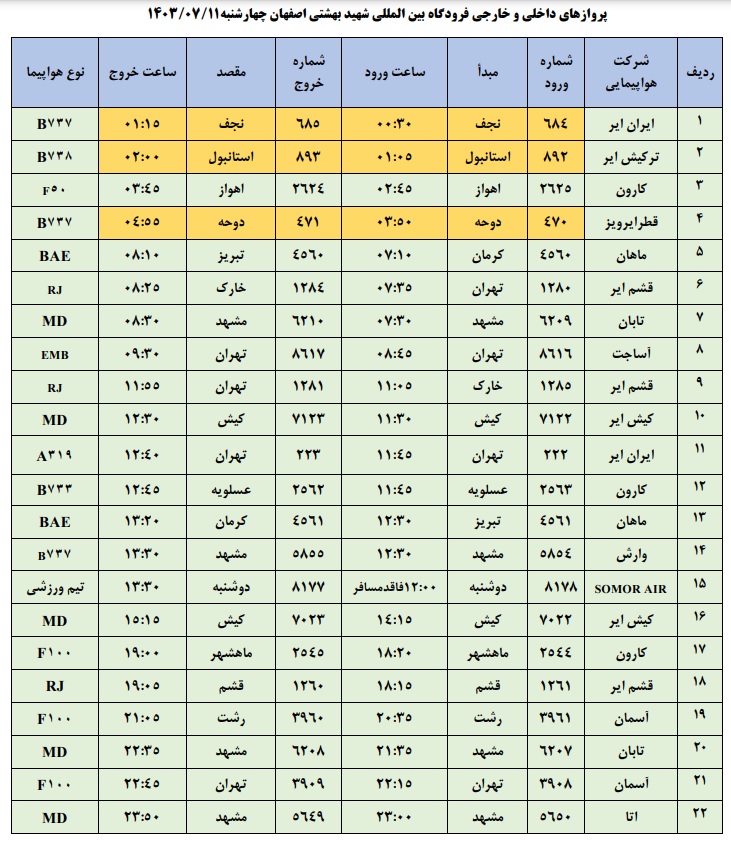 به گزارش نبض وطن، اطلاعات پروازهای داخلی و خارجی فرودگاه بینالمللی شهید بهشتی اصفهان امروز _چهارشنبه یازدهم مهر_ به شرح زیر است: