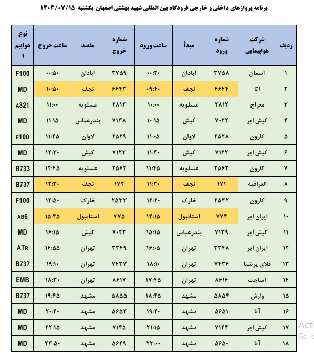 به گزارش نبض وطن، اطلاعات پروازهای داخلی و خارجی فرودگاه بینالمللی شهید بهشتی اصفهان امروز _یکشنبه پانزدهم مهر_ به شرح زیر است: