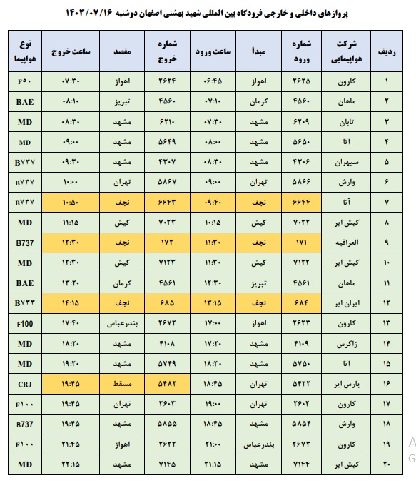 به گزارش نبض وطن، اطلاعات پروازهای داخلی و خارجی فرودگاه بینالمللی شهید بهشتی اصفهان امروز _دوشنبه شانزدهم مهر_ به شرح زیر است: