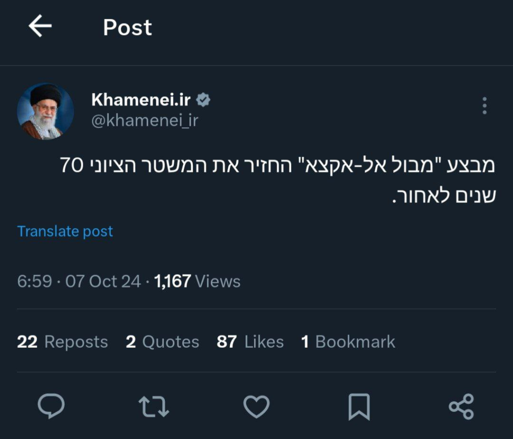 همزمان با ساعت آغاز عملیات طوفانالاقصی در سال گذشته، رسانه KHAMENEI.IR جملهای از بیانات حضرت آیتالله خامنهای رهبر معظم انقلاب اسلامی را به زبان عبری در صفحه توئیتر (ایکس) منتشر کرد.