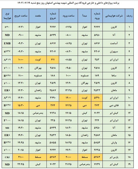 به گزارش نبض وطن، اطلاعات پروازهای داخلی و خارجی فرودگاه بینالمللی شهید بهشتی اصفهان امروز _پنجشنبه نوزدهم مهر_ به شرح زیر است: