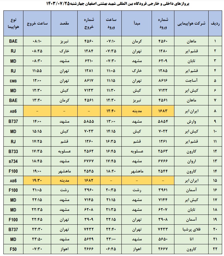 به گزارش نبض وطن، اطلاعات پروازهای داخلی و خارجی فرودگاه بینالمللی شهید بهشتی اصفهان امروز _چهارشنبه بیست و پنجم مهر_ به شرح زیر است: