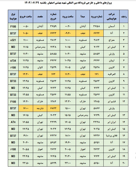 به گزارش نبض وطن، اطلاعات پروازهای داخلی و خارجی فرودگاه بینالمللی شهید بهشتی اصفهان امروز _یکشنبه بیست و نهم مهر_ به شرح زیر است:
