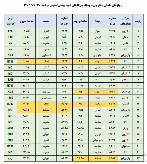 به گزارش نبض وطن، اطلاعات پروازهای داخلی و خارجی فرودگاه بینالمللی شهید بهشتی اصفهان امروز _دوشنبه سیام مهر_ به شرح زیر است: