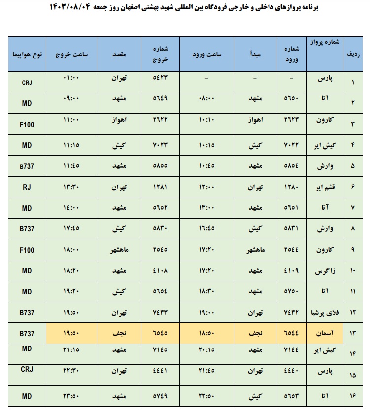 به گزارش نبض وطن، اطلاعات پروازهای داخلی و خارجی فرودگاه بینالمللی شهید بهشتی اصفهان امروز _جمعه چهار آبان_ به شرح زیر است:
