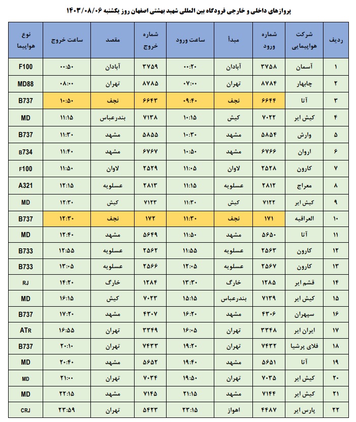 به گزارش نبض وطن، اطلاعات پروازهای داخلی و خارجی فرودگاه بینالمللی شهید بهشتی اصفهان امروز _یکشنبه ششم آبان_ به شرح زیر است: