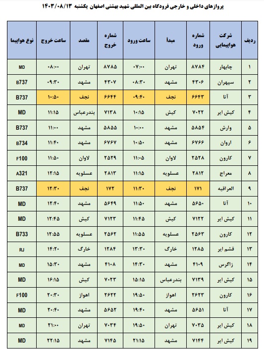 به گزارش نبض وطن، اطلاعات پروازهای داخلی و خارجی فرودگاه بینالمللی شهید بهشتی اصفهان امروز _یکشنبه سیزدهم آبان_ به شرح زیر است:
