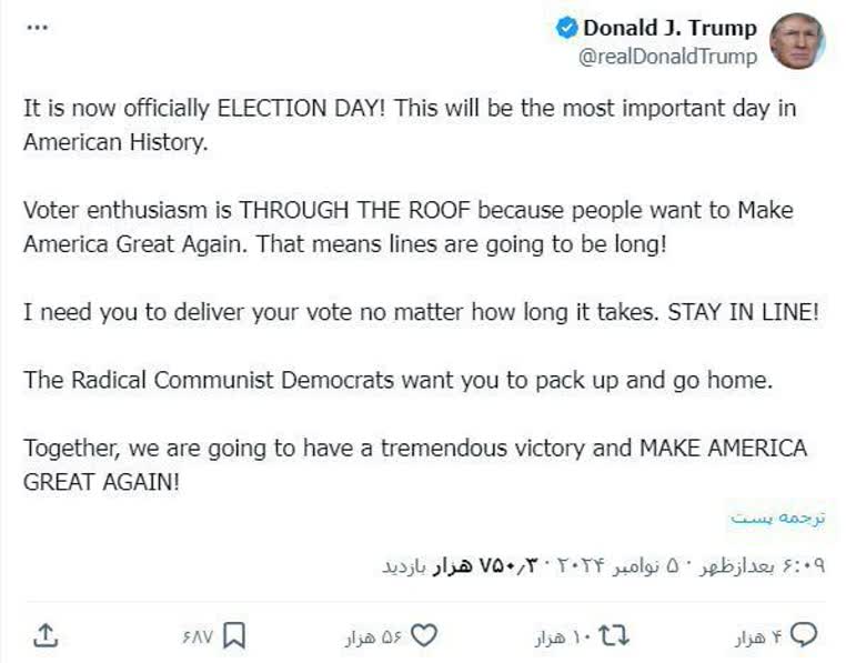 به گزارش نبض وطن، در همین راستا، ترامپ در شبکه اجتماعی «ایکس» برای دعوت از شهروندان آمریکا در جهت مشارکت در انتخابات ریاست جمهوری این کشور، نوشت: «امروز، رسما روز انتخابات است! امروز، مهمترین روز در تاریخ آمریکا خواهد بود.»