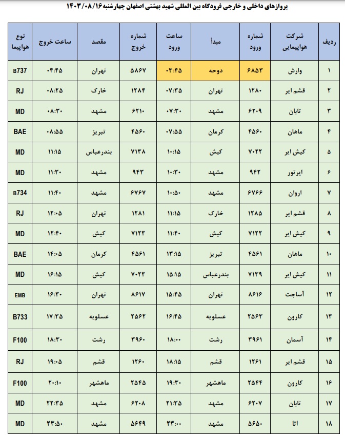 به گزارش نبض وطن، اطلاعات پروازهای داخلی و خارجی فرودگاه بینالمللی شهید بهشتی اصفهان امروز _]چهرشنبه شانزدهم آبان_ به شرح زیر است: