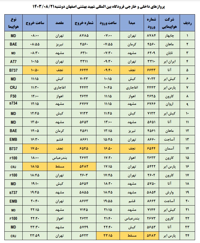 به گزارش نبض وطن، اطلاعات پروازهای داخلی و خارجی فرودگاه بینالمللی شهید بهشتی اصفهان امروز _دوشنبه بیست و یکم آبان_ به شرح زیر است:
