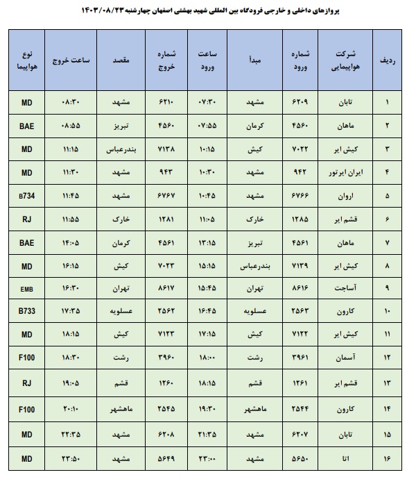 به گزارش نبض وطن، اطلاعات پروازهای داخلی و خارجی فرودگاه بینالمللی شهید بهشتی اصفهان امروز _چهارشنبه بیست و سوم آبان_ به شرح زیر است: