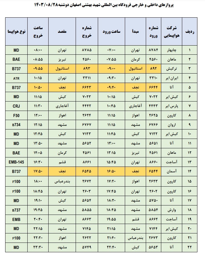به گزارش نبض وطن، اطلاعات پروازهای داخلی و خارجی فرودگاه بینالمللی شهید بهشتی اصفهان امروز _دوشنبه بیست و هشتم آبان_ به شرح زیر است: